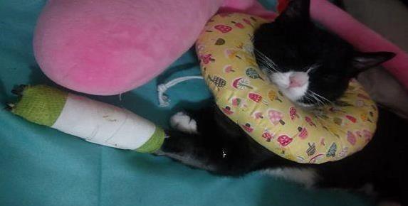 赶紧抱去检查,果然腿骨折了。问题来了,宠物店都关门,平时跑得比谁都快的猫咪,这会儿只能靠主人想办法。幸好楼上住着个兽医,听说情况后,二话不说就把猫接了过去。